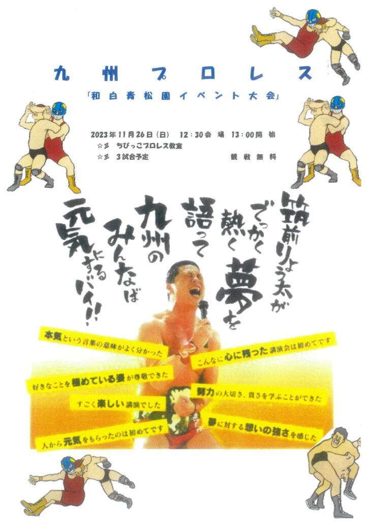 和白青松園後援会会長 筑前りょう太さんの九州プロレスが和白青松園体育館で開催されます。